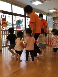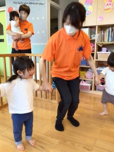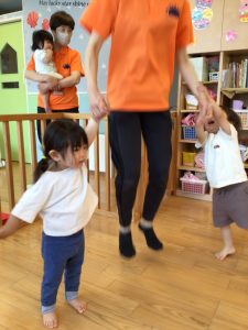 子どもたちのお気に入りの触れ合い遊び「遊園地に行こう」「飛べないペンギン」の体操の中にもジャンプをする場面があり、保育士と一緒に楽しんでいます
