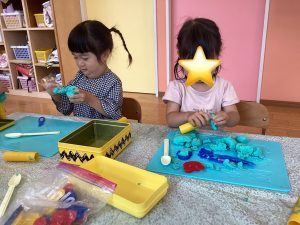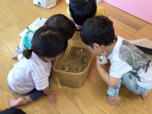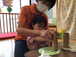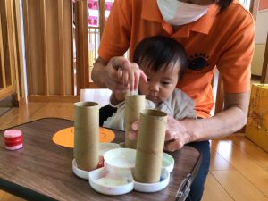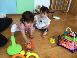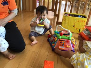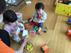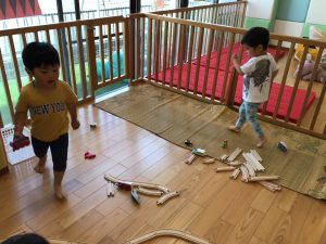 りんご組さんは活発に動き回っている男の子たちのそばで「お部屋は走らないよ」という様子で座って落ち着いて遊んでいる女の子たち![]()