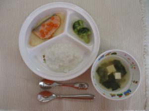 粥 味噌汁 魚と人参煮 ブロッコリーのだし煮
