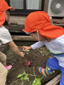 絵本の世界と実体験が結びついて、土の中からさつまいもが出てきた時には「おいもだ!」と歓声が上がっていましたよ😆