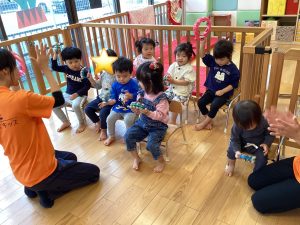 0歳児さん、1歳児さんにはまだ難しいと思いますが、一緒に楽器を鳴らして楽しんでいますよ![]()