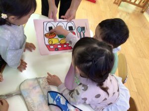 おべんとうのおかずたちが次々に名前をよばれると「はーい! 」と子どもたちも元気に返事😆