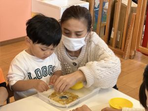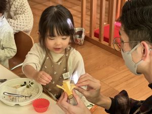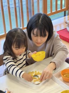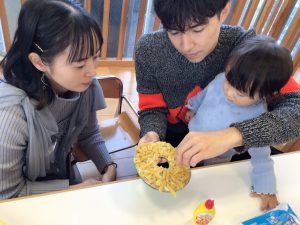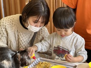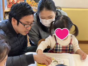 保護者の方と一緒に、かわいいリースが出来上がっていきます🎄