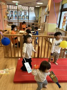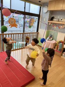 室内でも身体を動かして楽しんでいる子どもたちですよ![]()