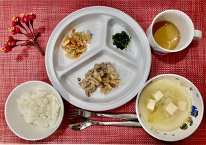 サンライズキッズ保育園 ◎給食の様子 今日は、大好きな豚焼肉と一緒にご飯をたくさん食べてくれていまし...