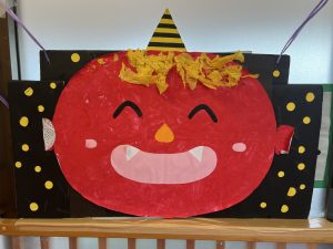 サンライズキッズ保育園 ◎給食の様子 今日は節分会で、ハンバーグが鬼の顔に! 子どもた...