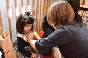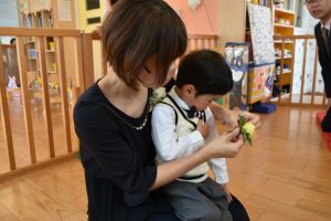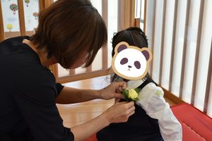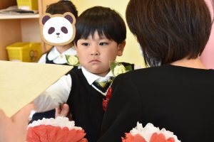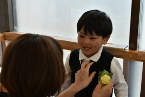 担任の先生からコサージュを付けてもらうと💐