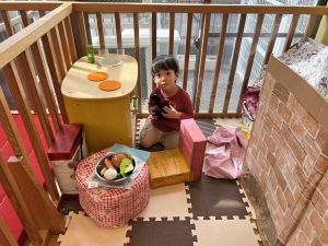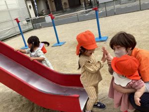 柵越しに、1,2歳児さんの様子を眺めている様子も、とってもかわいいですよ![]()