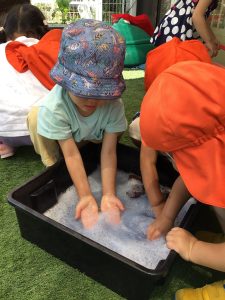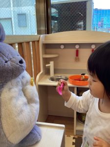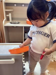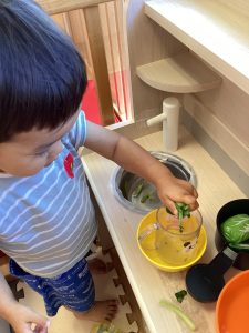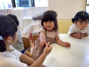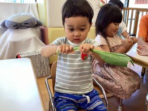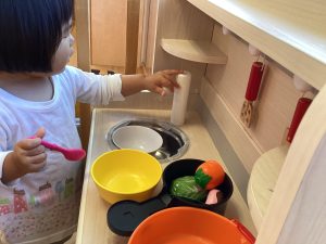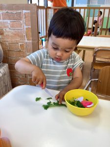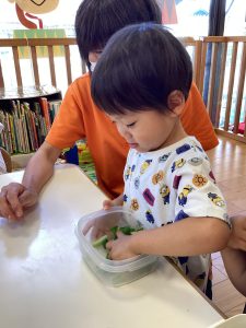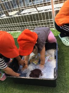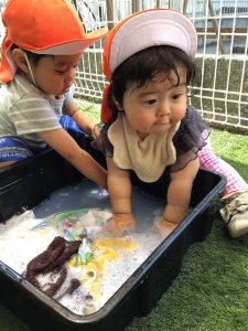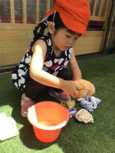2歳児さんは、なんと、石鹸を大根おろし器で削るところから挑戦です