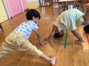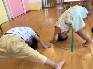 ママのヨガ中、子どもたちは自由に遊んでいたり、一緒になってヨガのポーズをとったり…