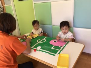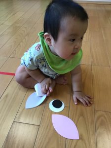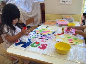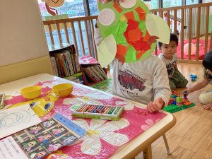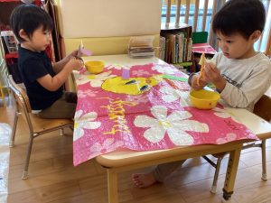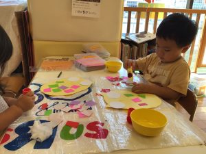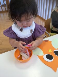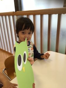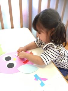 もも組さん、いちご組さんは好きな色を選んで、ペタペタとフクロウさんの洋服や大きな目と羽をつけました