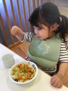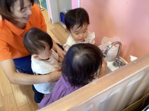 「給食、食べるよ」に誘われて、急いで手洗いをしてエプロンをつけて、準備万端のいちご組さん