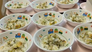 (写真は離乳食後期です。年齢によって形、固さ、盛り付け量を変えて、提供しています。)