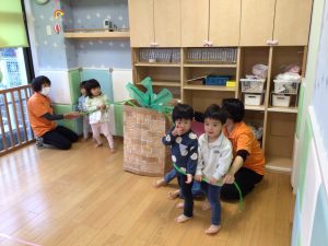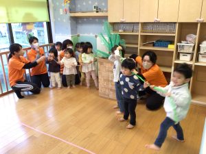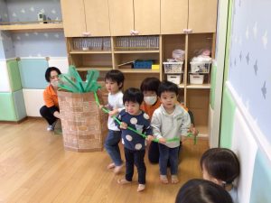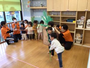 りんご組さんがリードしながらみんなで引っ張ると大きなかぶがぬけました![]()