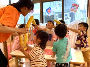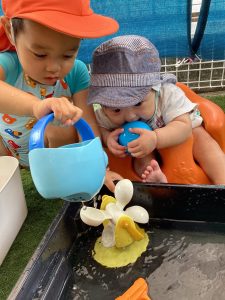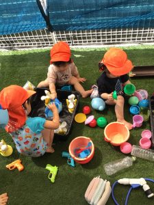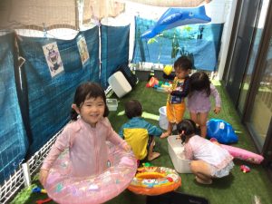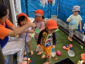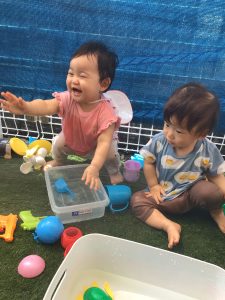 熱中症警戒アラートが出る中、時間は短くなってしまいましたが可愛い笑顔いっぱいで楽しんだ水遊び