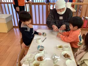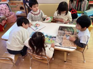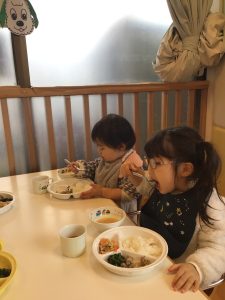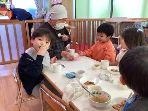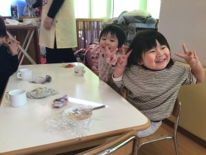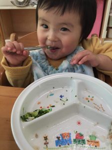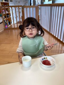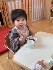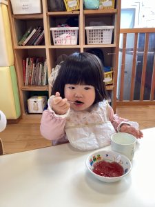 いちごくみさんもりんごぐみさんの様子をよく見ていて、真似していますよ![]()