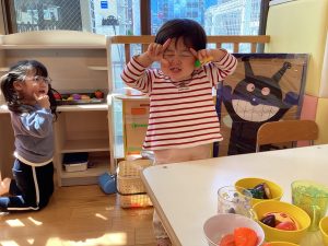 りんご組さん🍎はお友だちと一緒に遊ぶことを楽しんで、「お買い物行って来ま〜す」とかばんを持ってお出かけ![]()