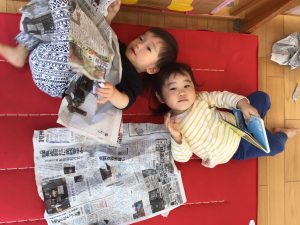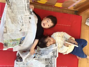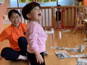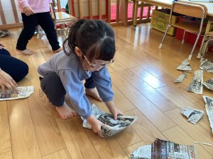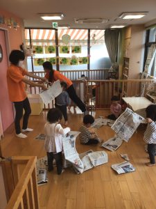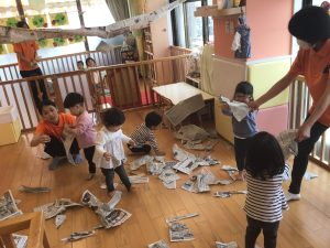 大きな新聞紙をビリビリ〜と破って大はしゃぎの子どもたち