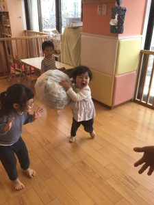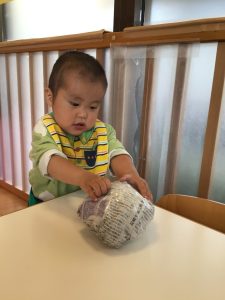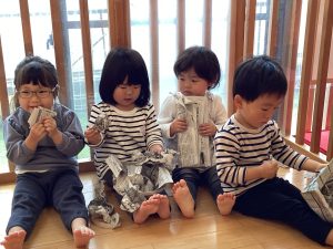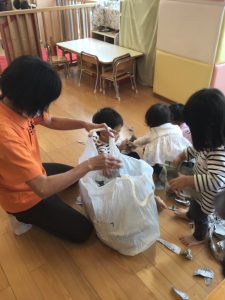 りんご組さんは、大きな袋に新聞紙を入れて何か作っていますよ