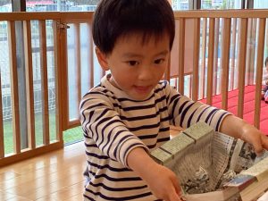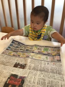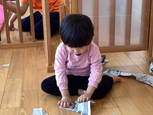 保育者と一緒に新聞紙をビリビリと破って音や感触を楽しみました