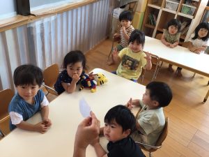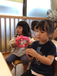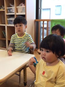と音に合わせて言葉にすると、1・2歳児の子どもたちは、音の高低や変化に反応する力が付いてきています