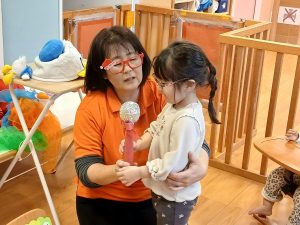 2歳児のお友だちはとっても上手に羽子板で打ち返していてビックリ‼