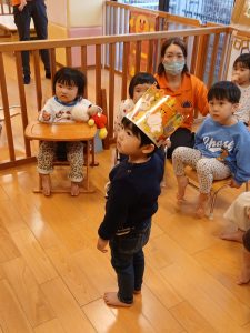 保育者やお友だちからの「おめでとう🎉」のお祝いの言葉に、恥ずかしそうにしていました![]()