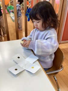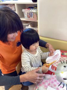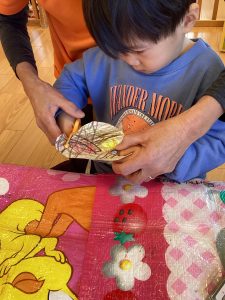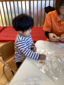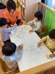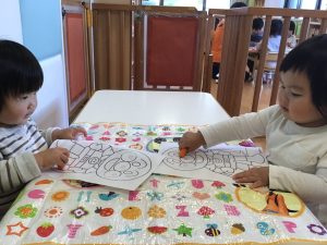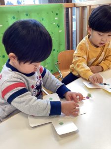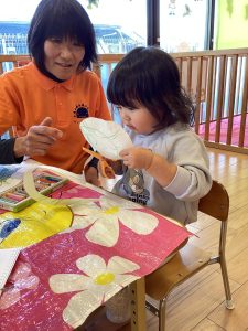 凧作りでは、2歳児さんたちは保育者と一緒にはさみ✂にチャレンジ![]()