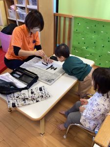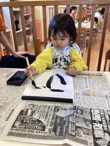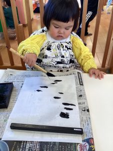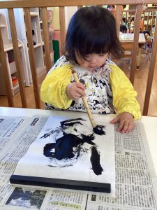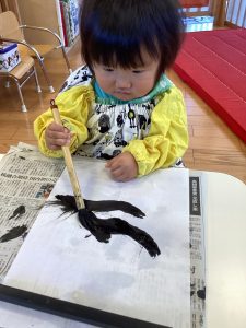 保育者の真似っこをしながら半紙に大胆な線を描いていましたよ![]()