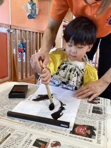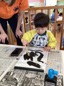 本物の墨汁を使うため、しっかりと保育者からの説明もありました![]()