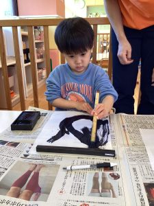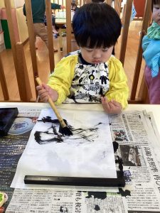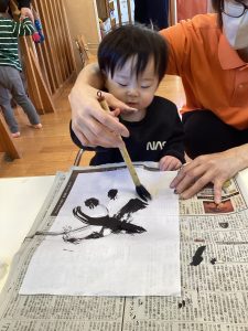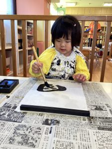 筆に付いた墨汁がしっかりと色が出ることが楽しかった様子で、