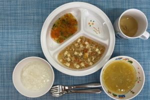 (写真は離乳食後期です。年齢によって形、固さ、盛り付け量を変えて提供しています。)