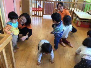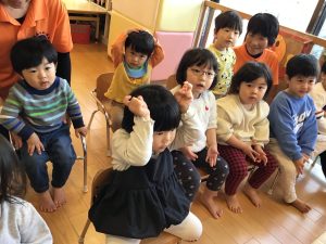 ハンドサインやリズム打ちでは、保育者の手の動きをじっと見つめ