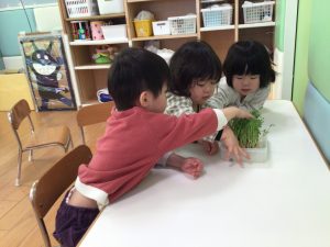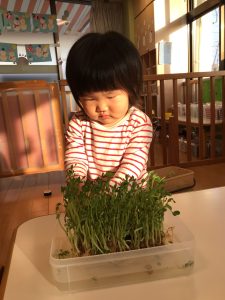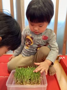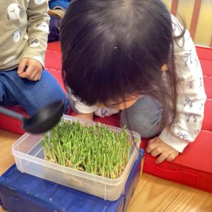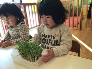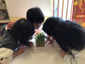 毎日の観察を通して、豆苗の育ちを感じている子どもたち🌱