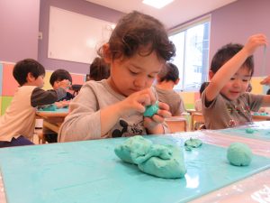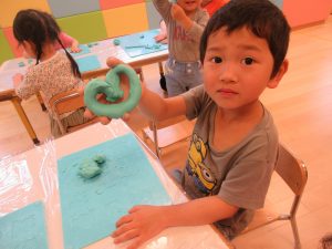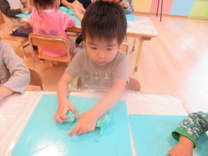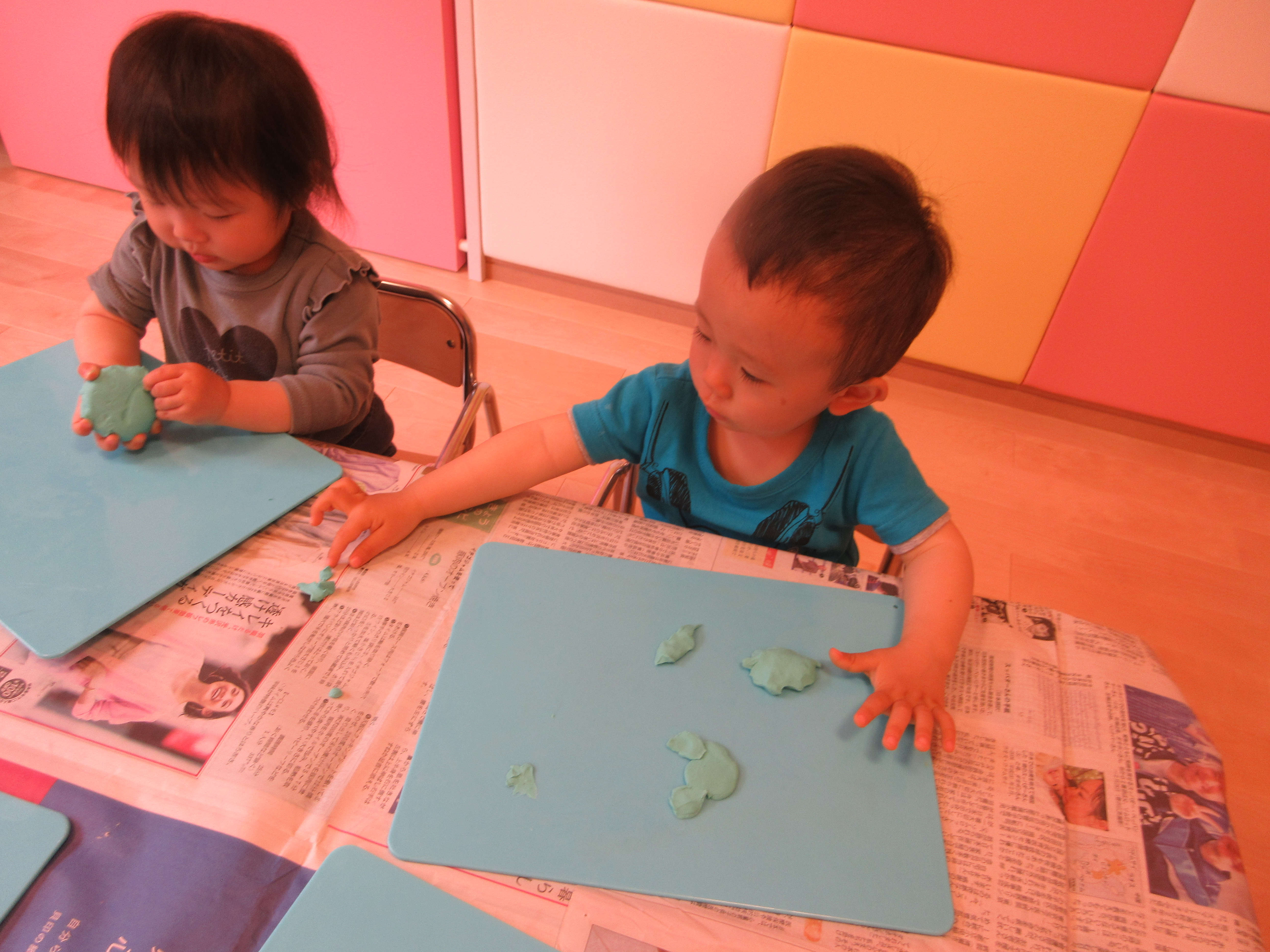 なにつくろうかな~。お友だちと集中してこねこね、、、お友だちの様子を見ながら、、、