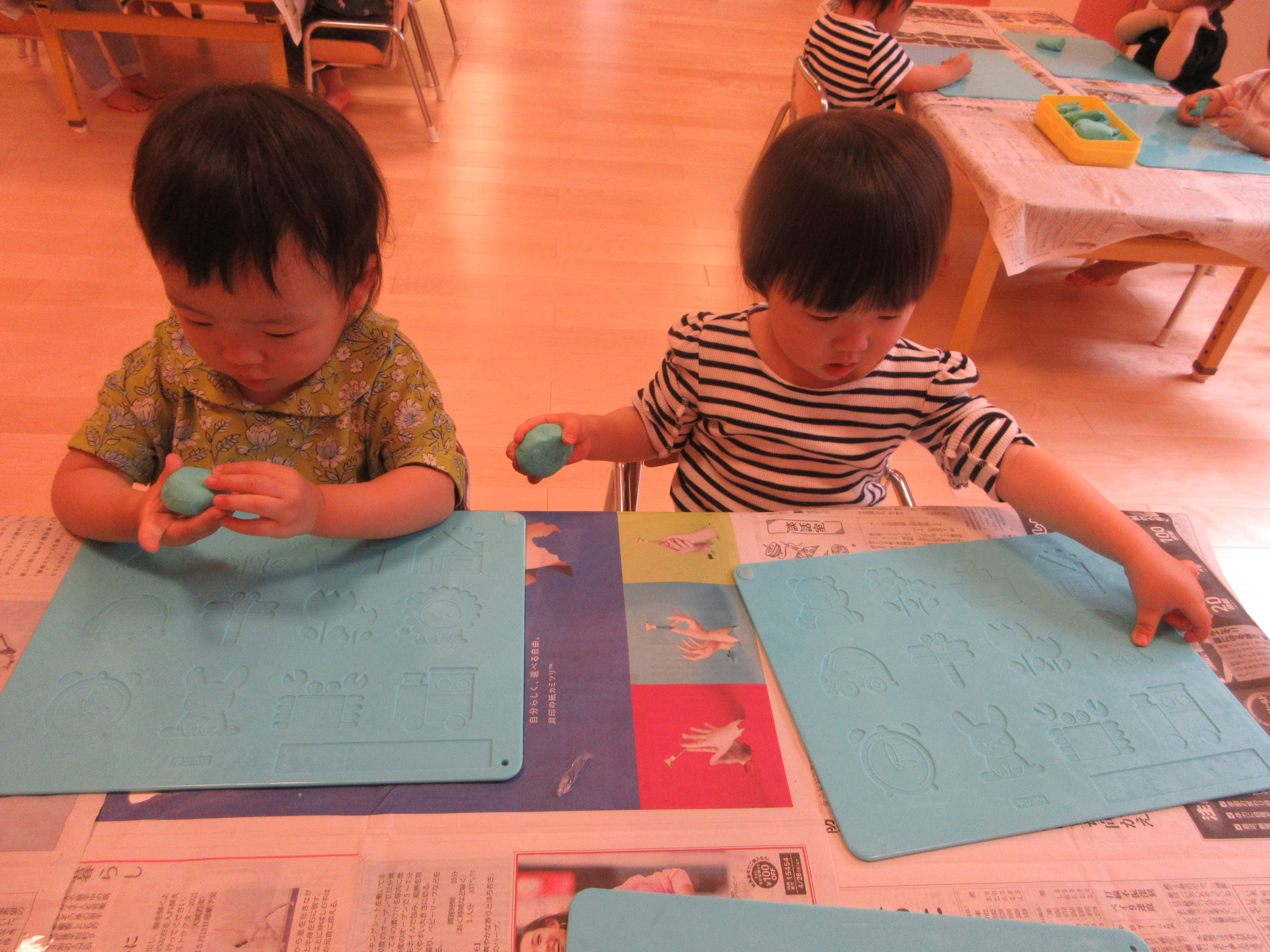 形の上にねんどを置きトントンして「あっ。あっ。」と指さしをして喜んでいました。