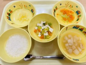 粥 味噌汁 豆腐の野菜あんかけ きゅうりと人参のくず煮 煮りんご