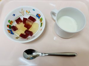 ※おやつのあじさいゼリーは、りんごジュースとぶどうジュースをそれぞれ寒天で固めて四角く切りました♪今の季節にぴったりで、視覚からも楽しいおやつになったと思います♪