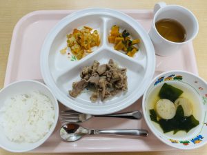 ご飯 すまし汁 豚肉のみそ炒め 白菜の煮浸し ゆでかぼちゃ