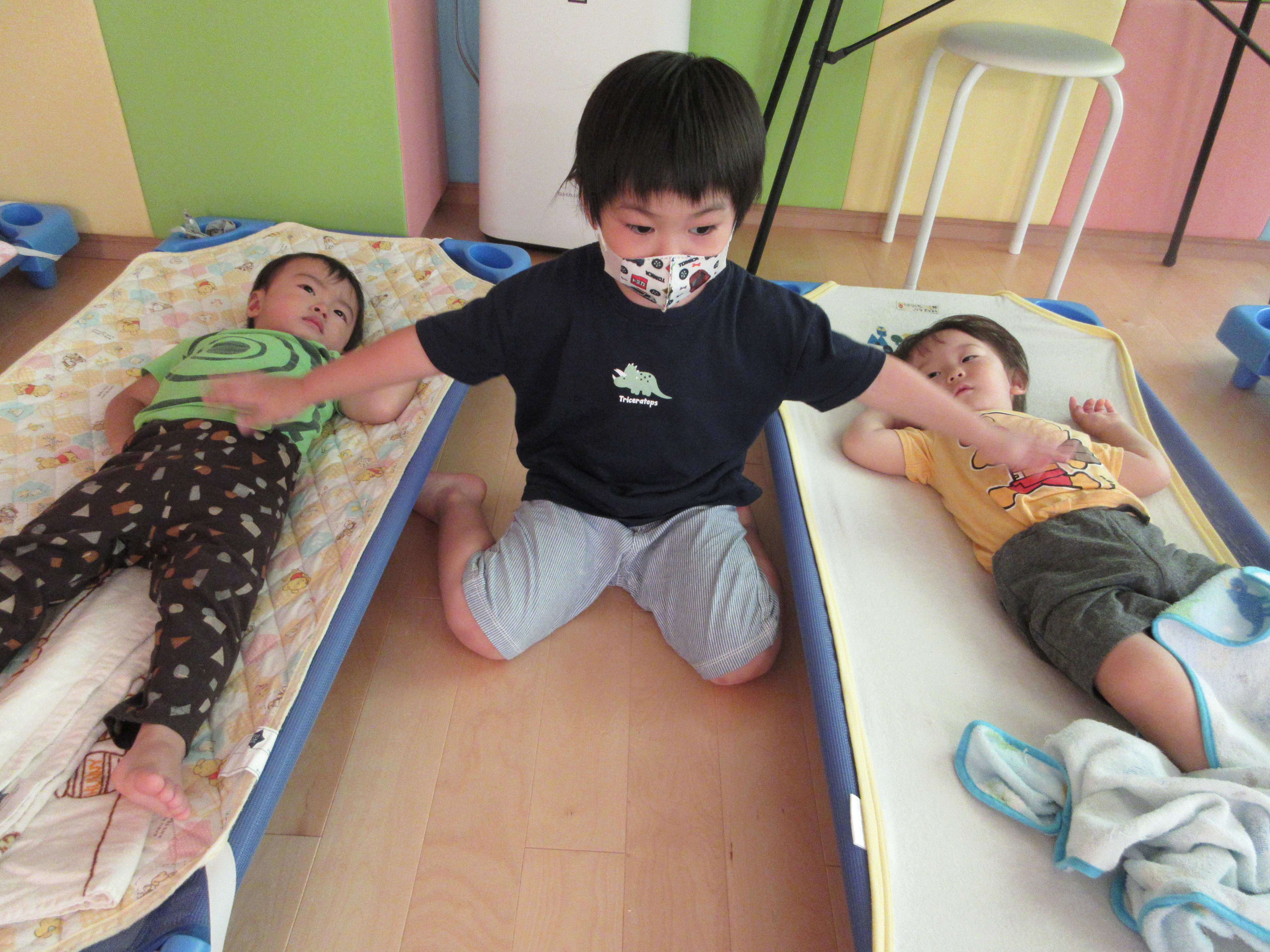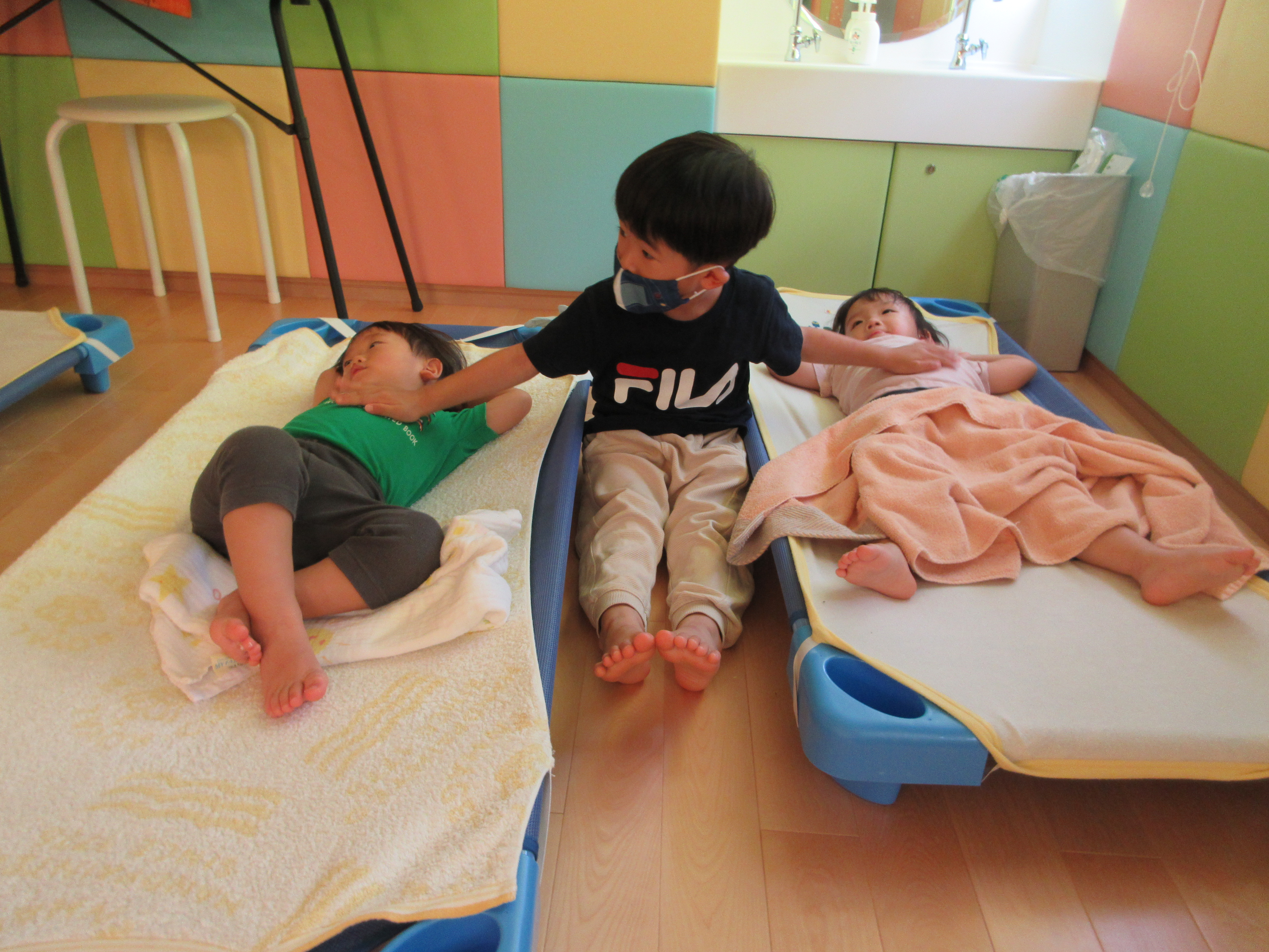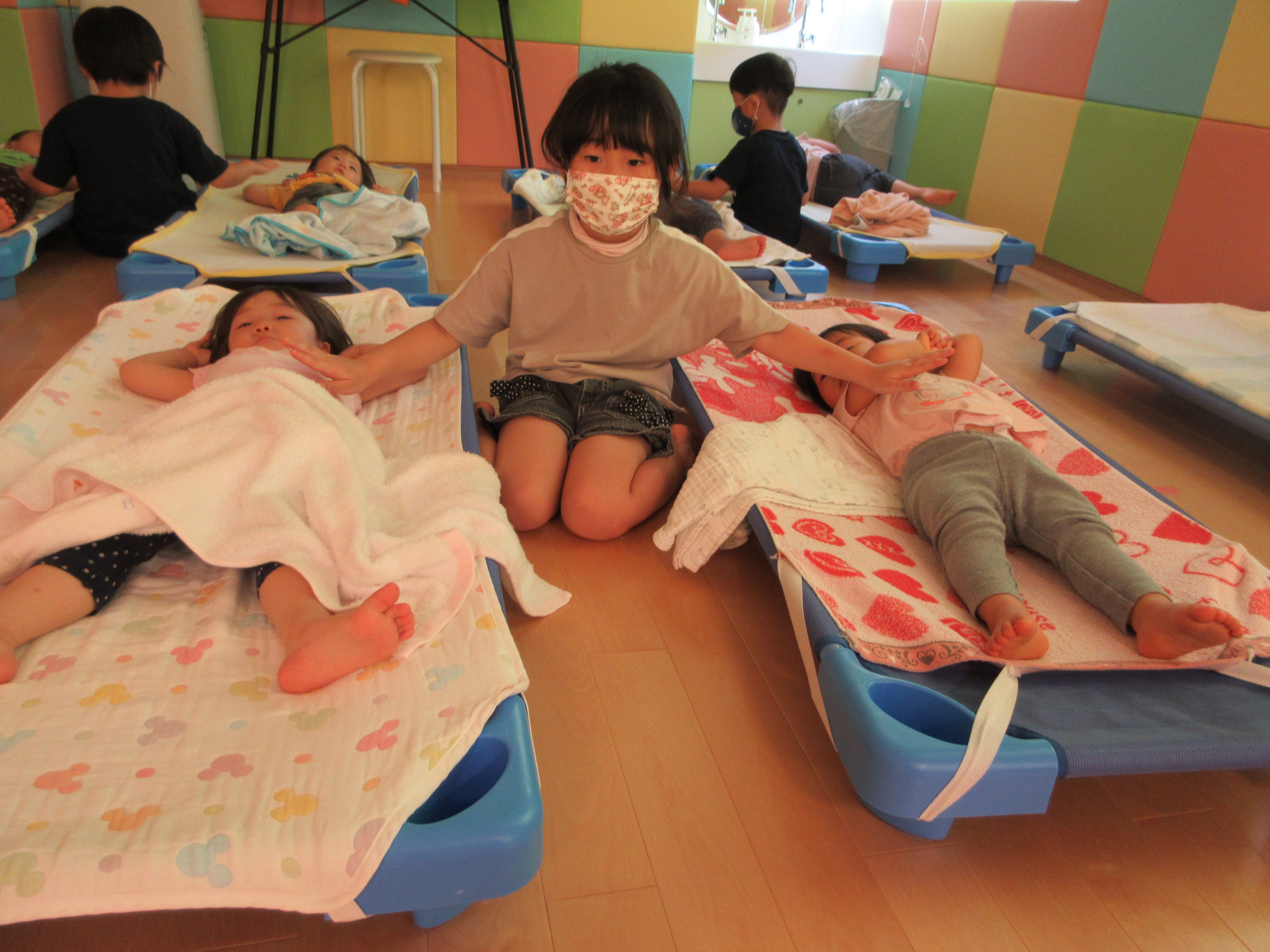 たくさん遊んで、保育園に帰ってきたら…ご飯を食べて、お昼寝です。