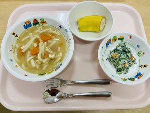 ※うどんは、食べにくかったら2cmくらいの長さに切ると良いです。食材の大きさは、基本的には子ども用スプーンにのるくらいの大きさに切ると良いです。