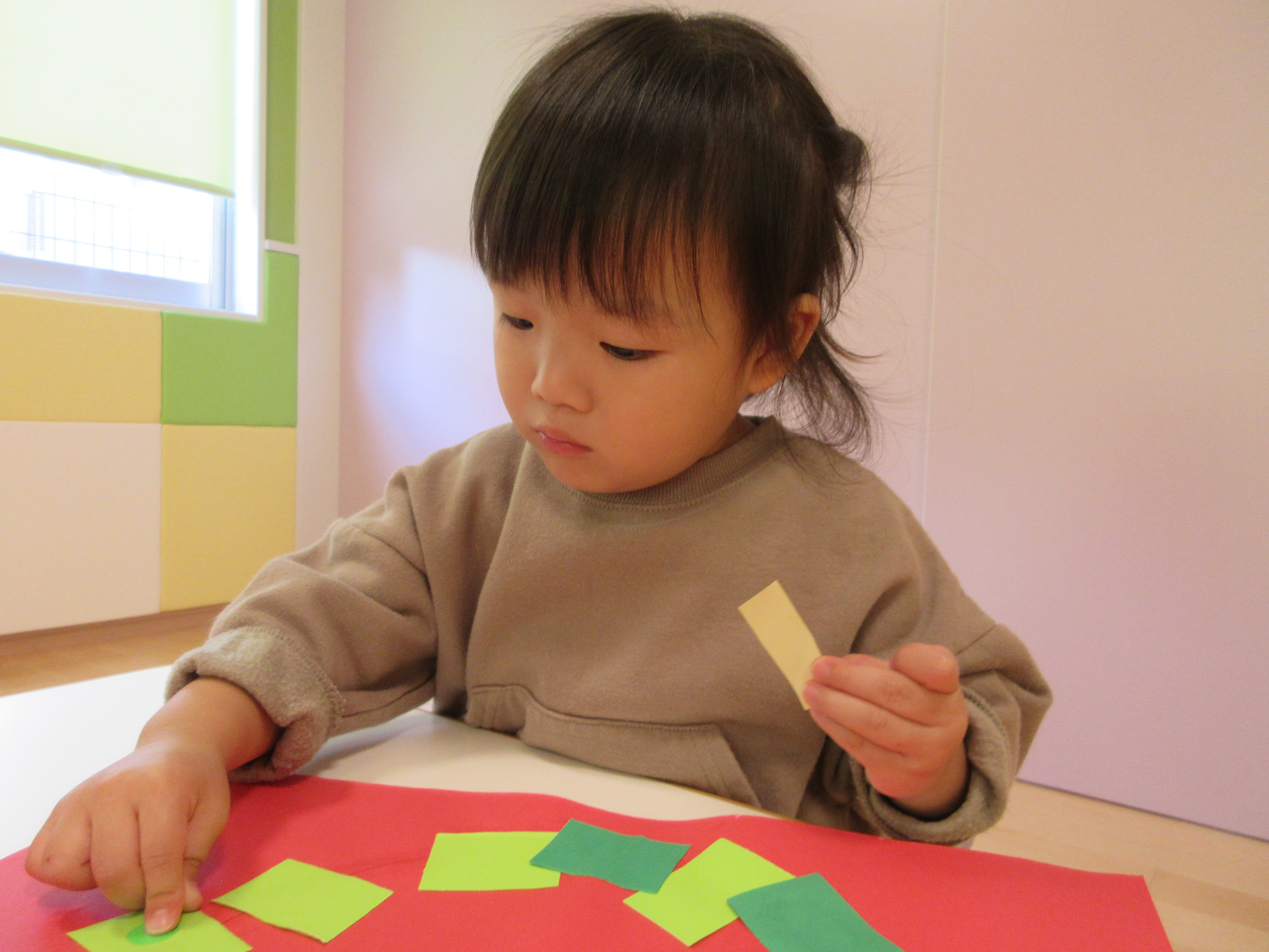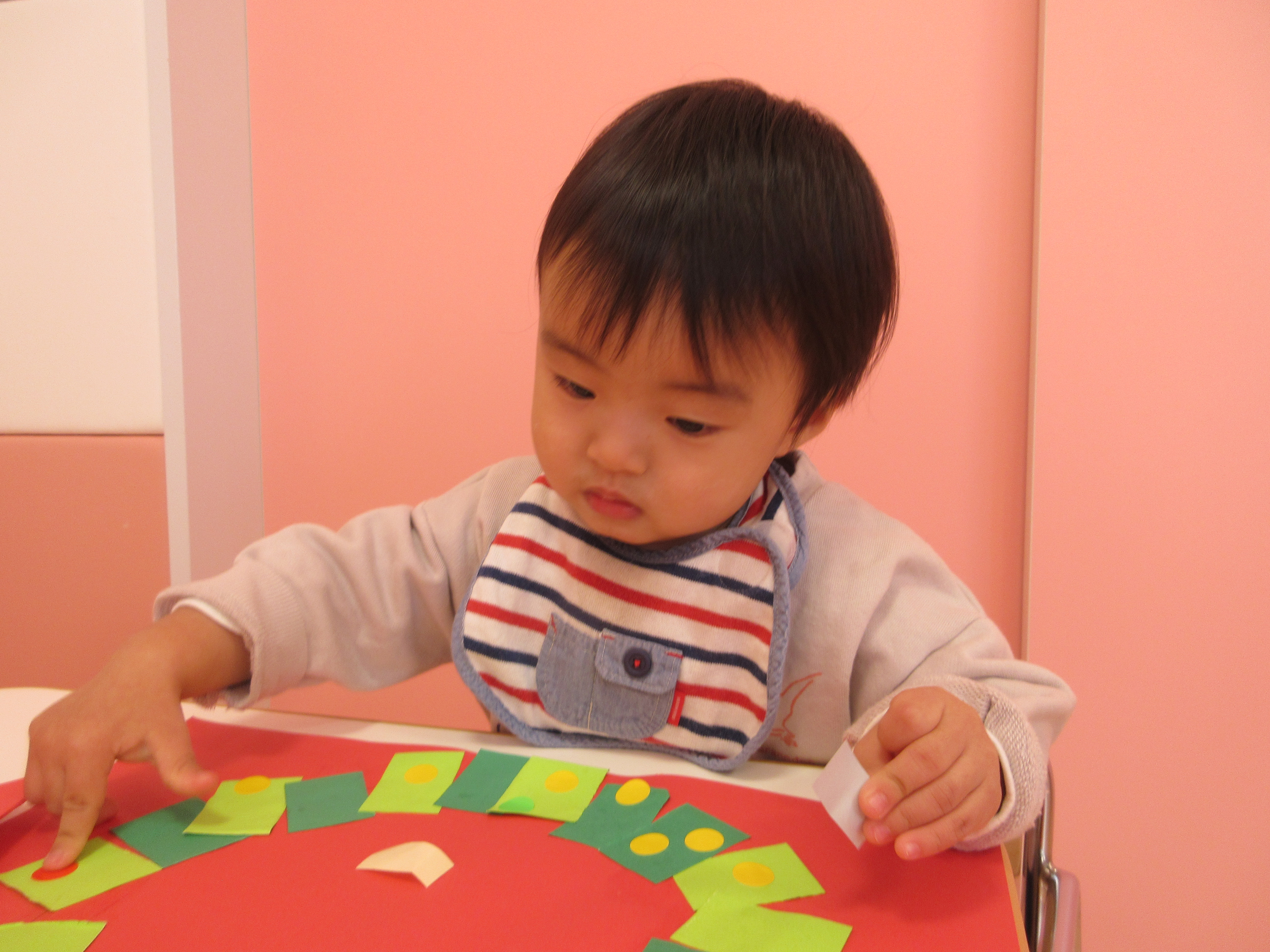 丸シールの色を見て、「あか」「きいろ」と話しながら楽しんで取り組んでいます(≧▽≦)