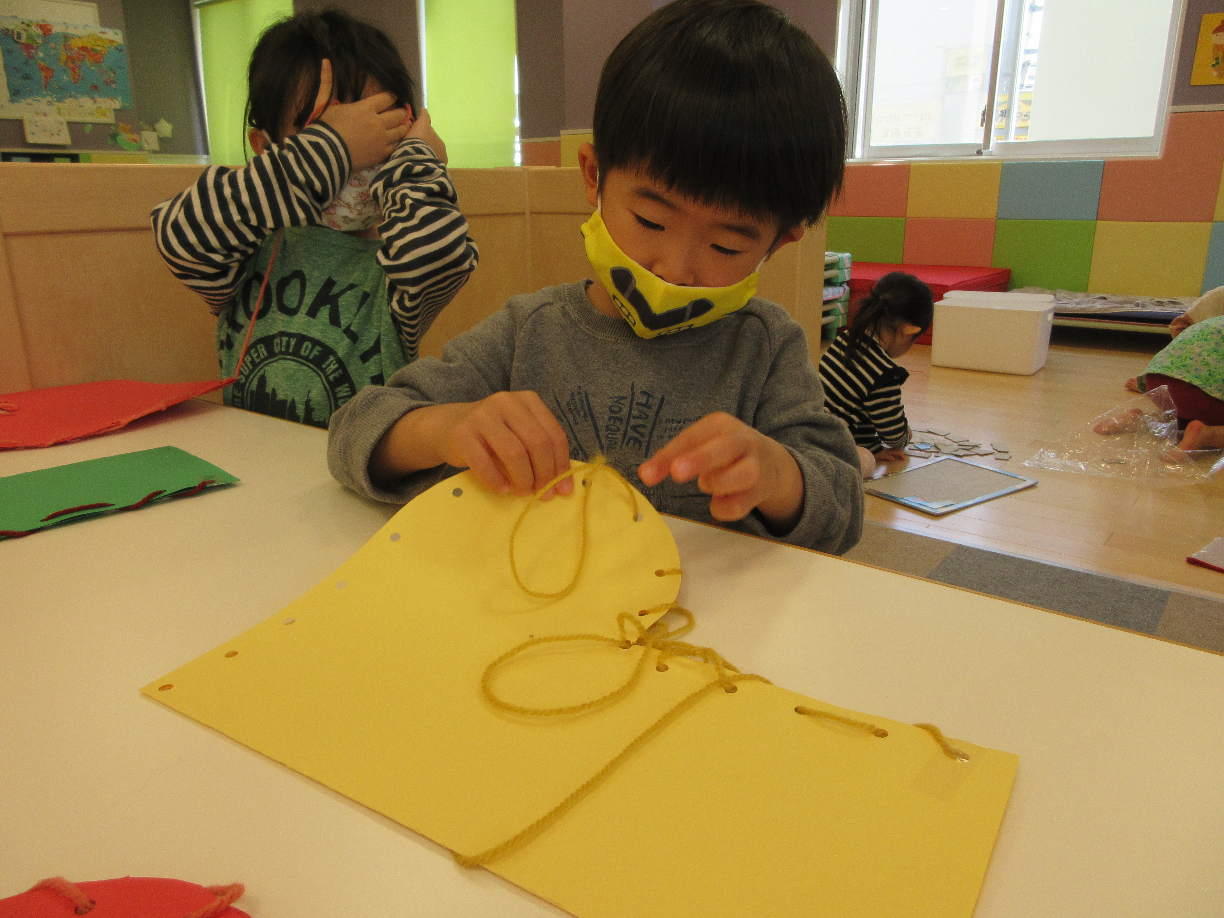 穴が開いている所にひもを通して、ひもが通ったら、次の穴へ![]()