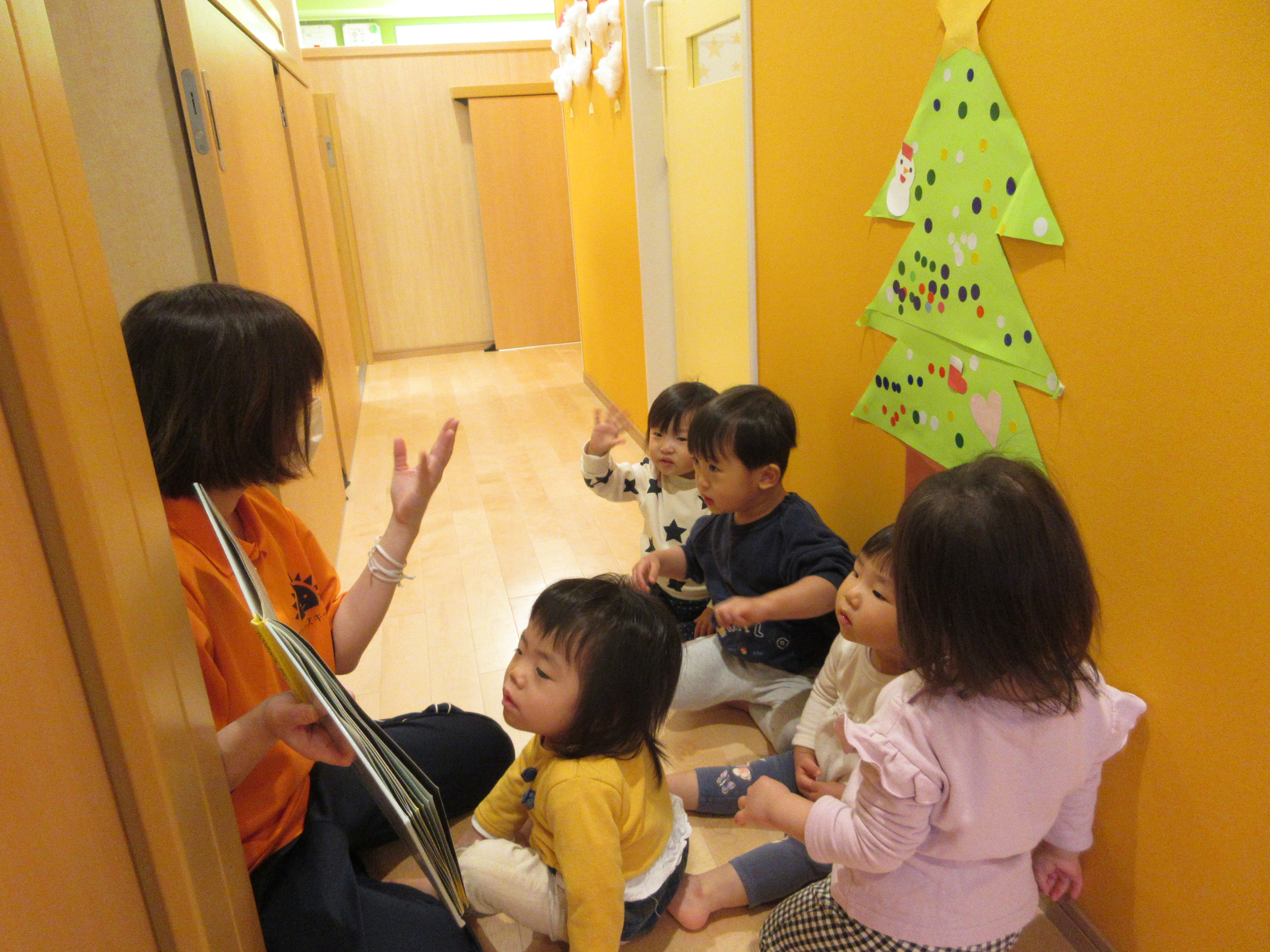 後ろの壁のクリスマスツリーの星を見つけ「あっ。あっ。」