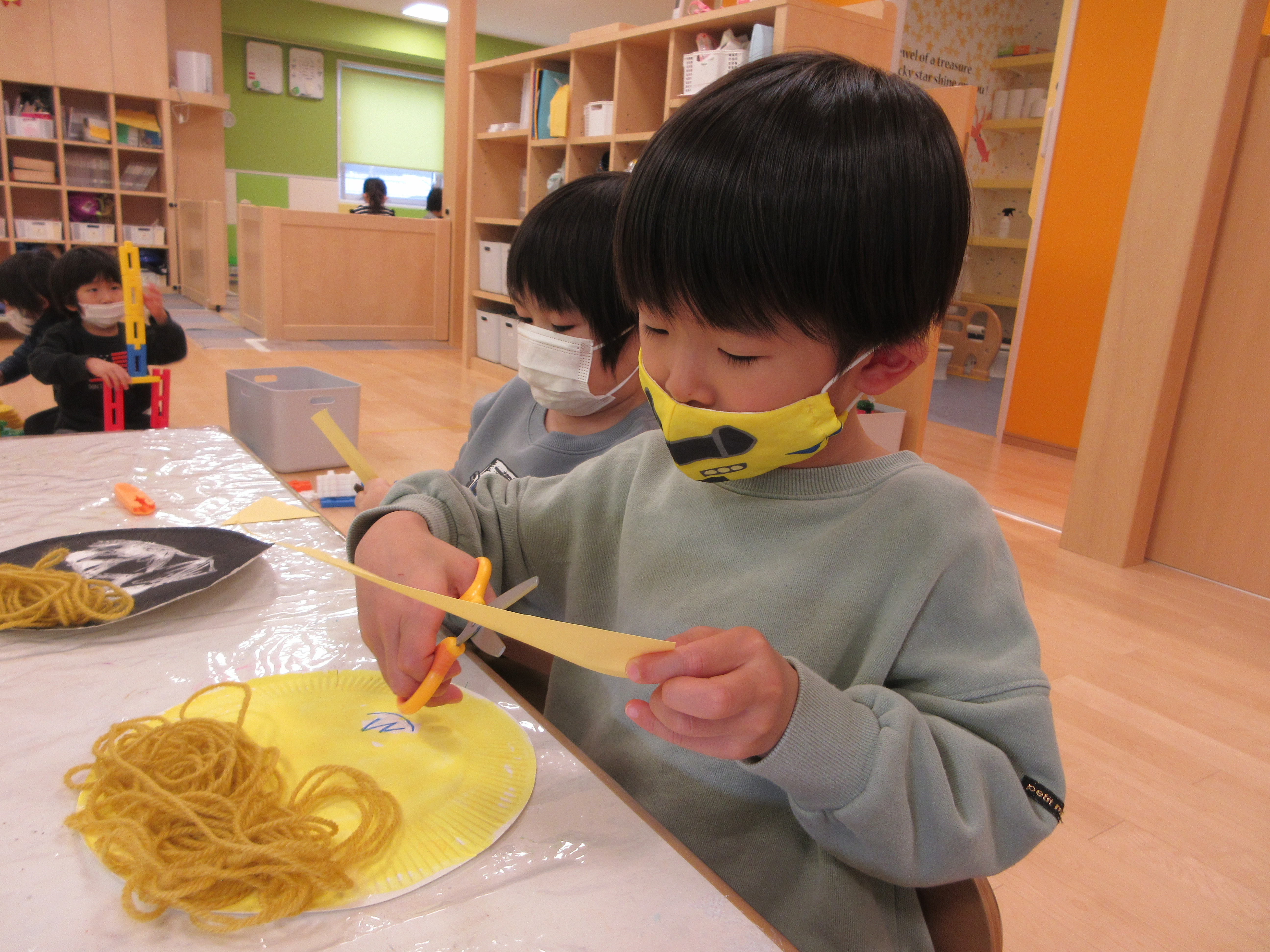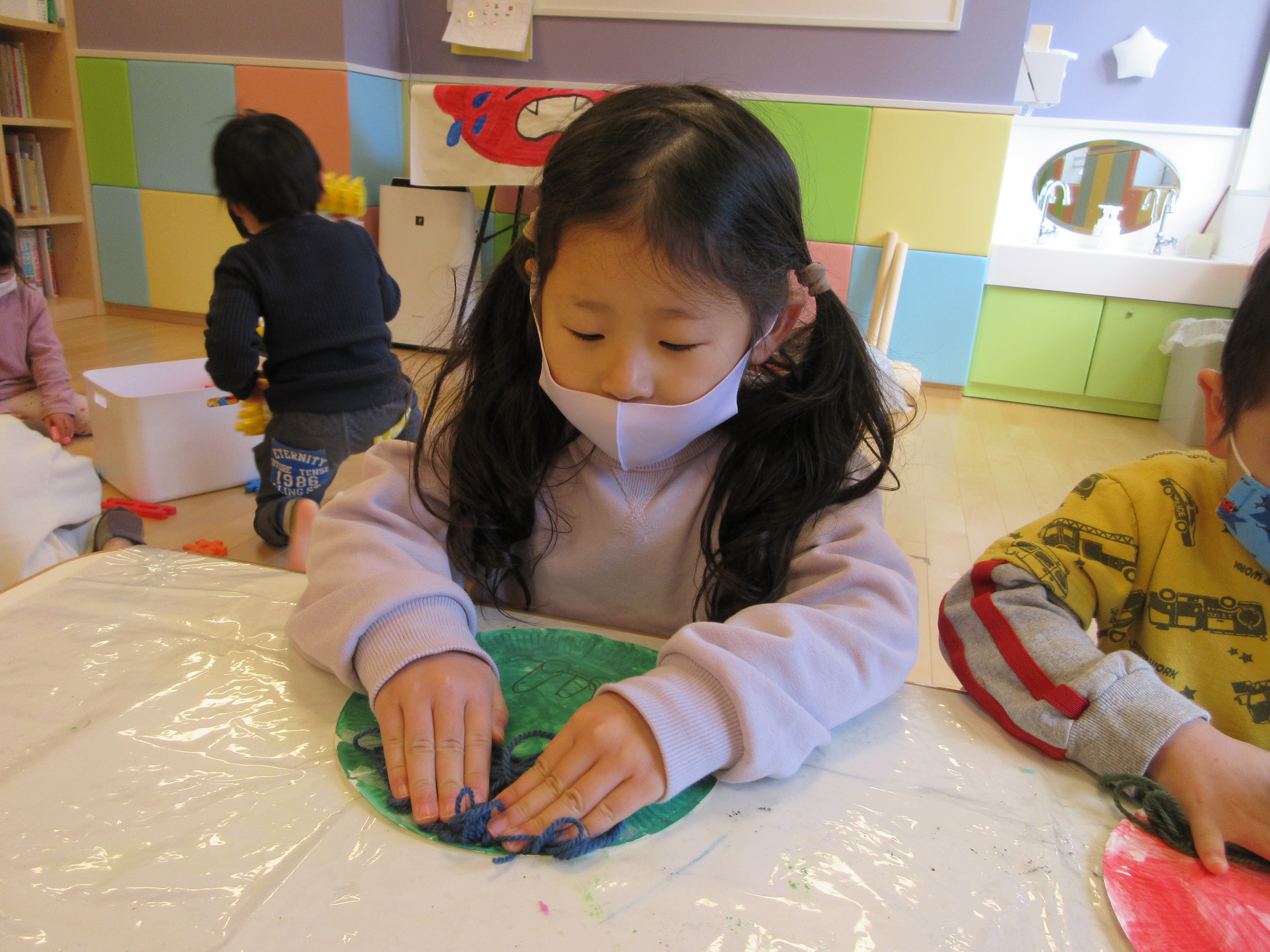 好きな色の毛糸を選び、一人ひとり個性的な鬼さんに変身中です(*´ω`*)