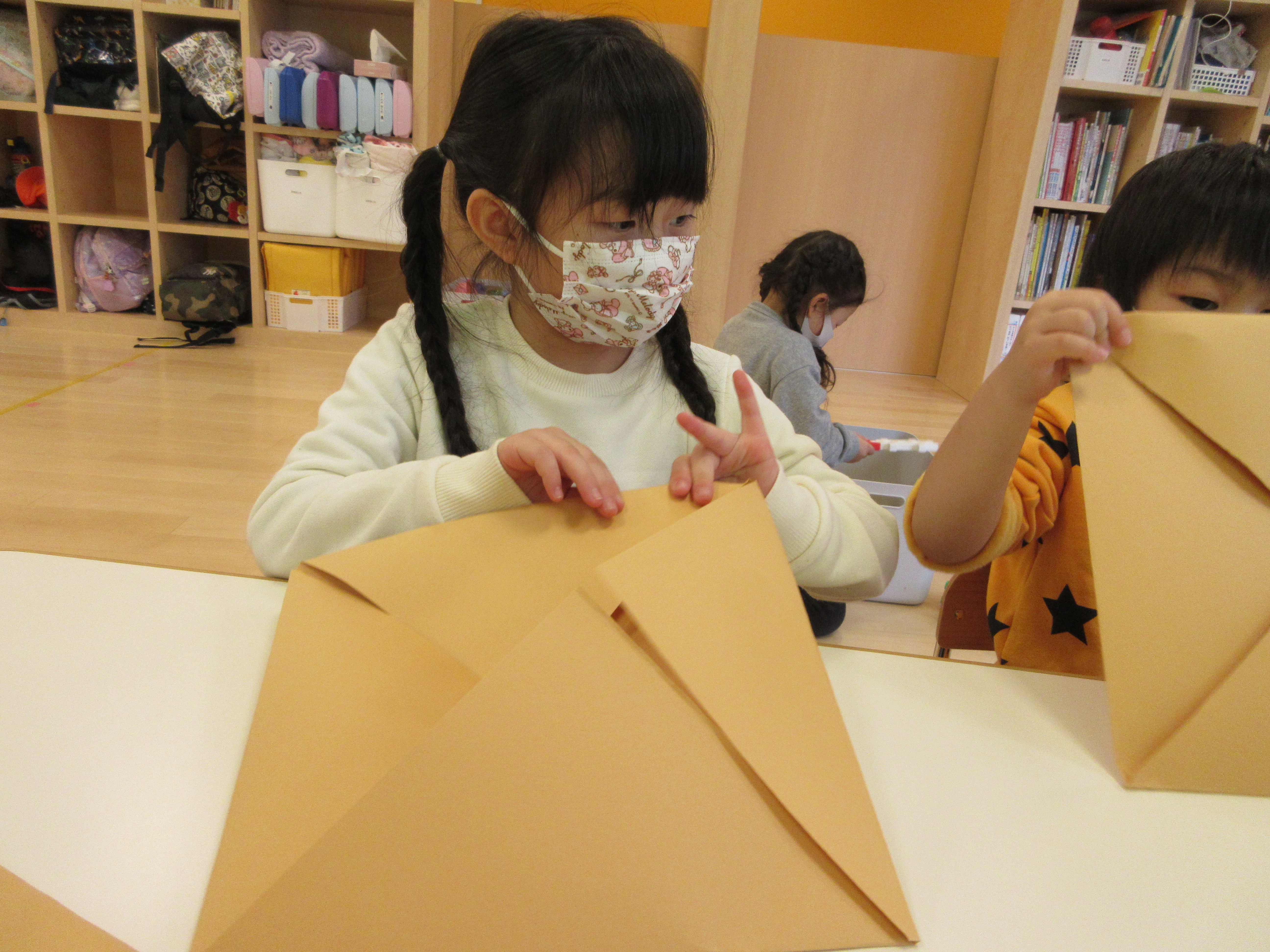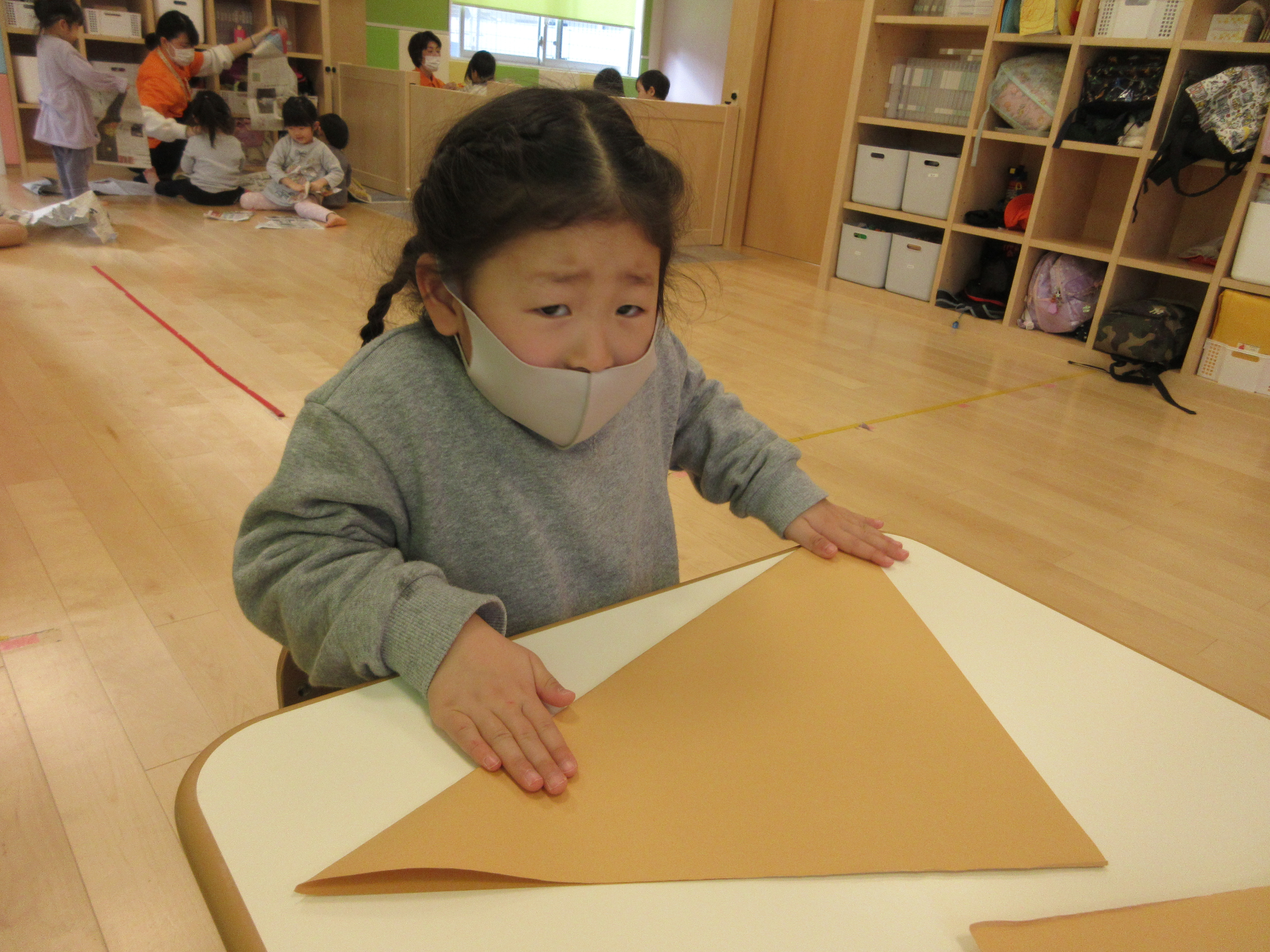 ではなく大きな画用紙を使って折り紙風に三方を作っている様子をご紹介いたします![]()