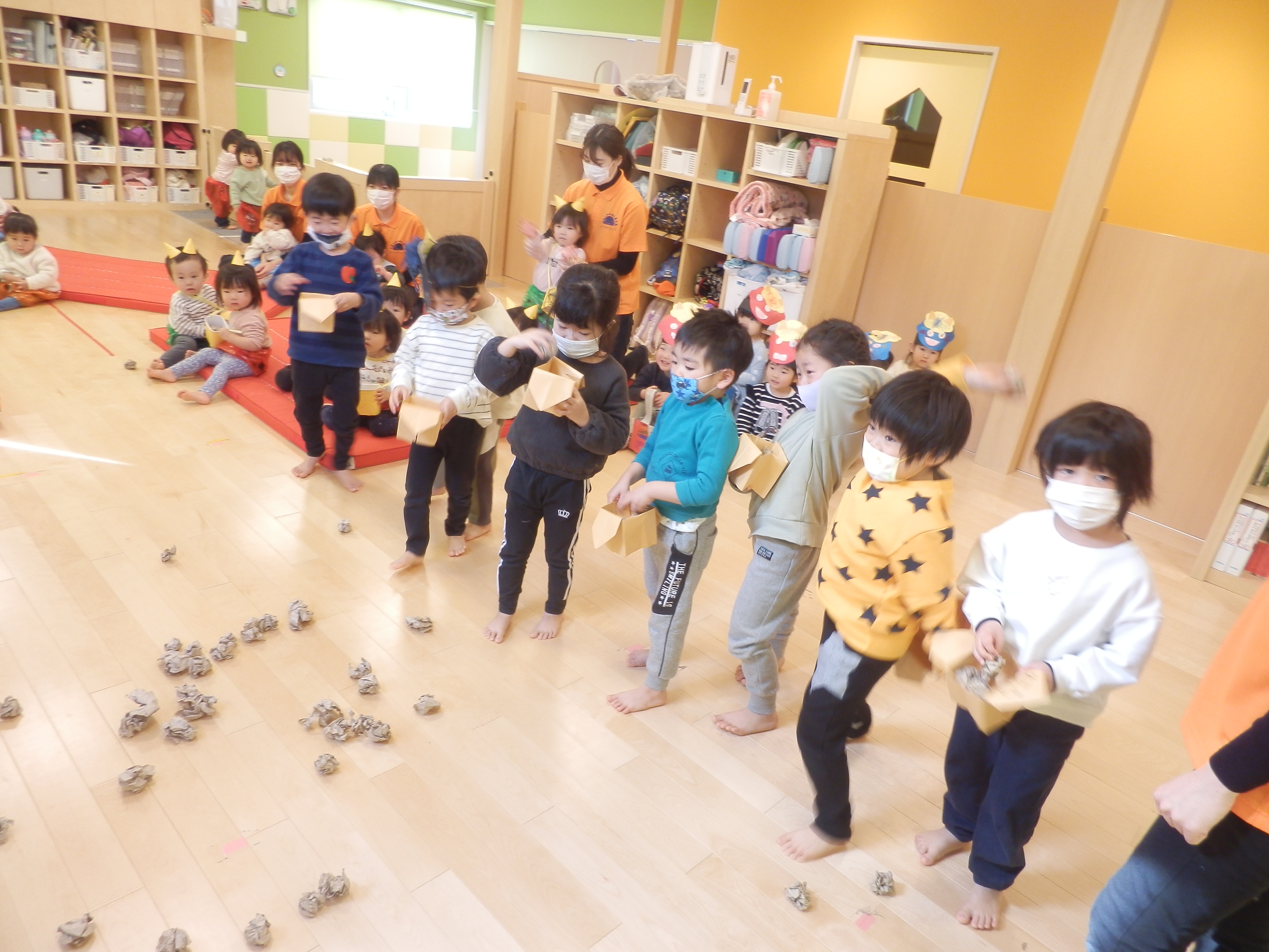 画用紙を丸めた豆で、豆まきをしました。