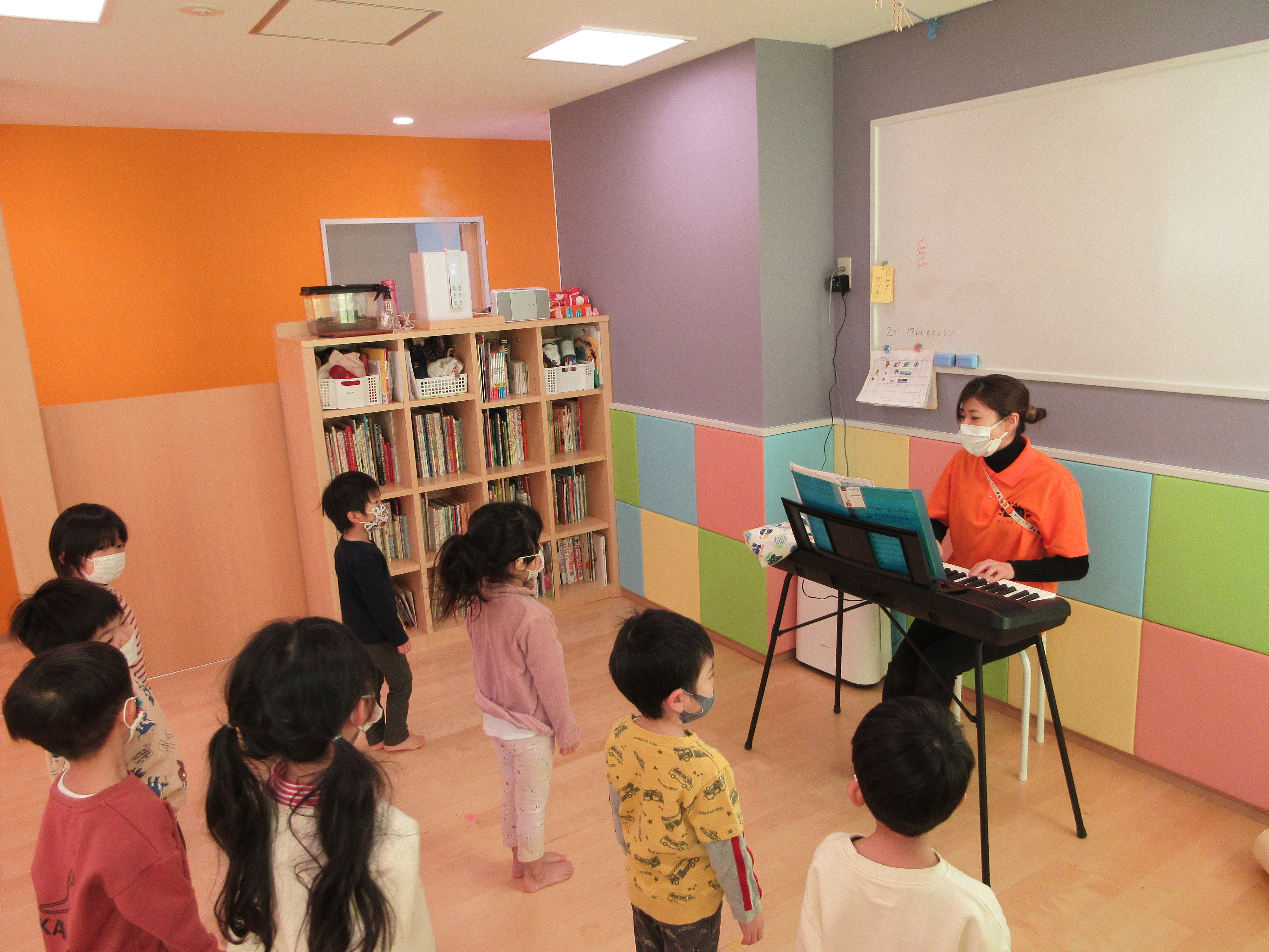 自分の場所に立って、保育士のピアノに合わせて、