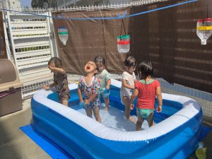 いちご組、りんご組の合同水遊びだと、水が苦手なお友だちも