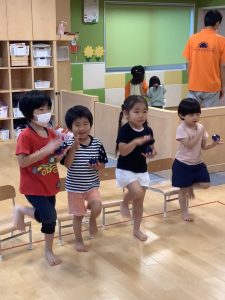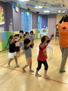 足踏みをしたり頭の上で叩いたり動きも入れると「楽しい」「面白い」とリズム遊びを楽しんでいました!